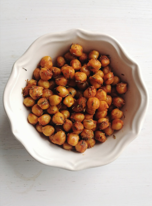 Coloque o grão de bico numa frigideira, tempere com sal, alho em pó, paprika (bastante, até ficarem vermelhinhos!) e tomilho. Envolva de forma a distribuir os temperos uniformemente. No final adicione o azeite, volte a envolver e leve a lume médio/alto mexendo sempre até tostarem!