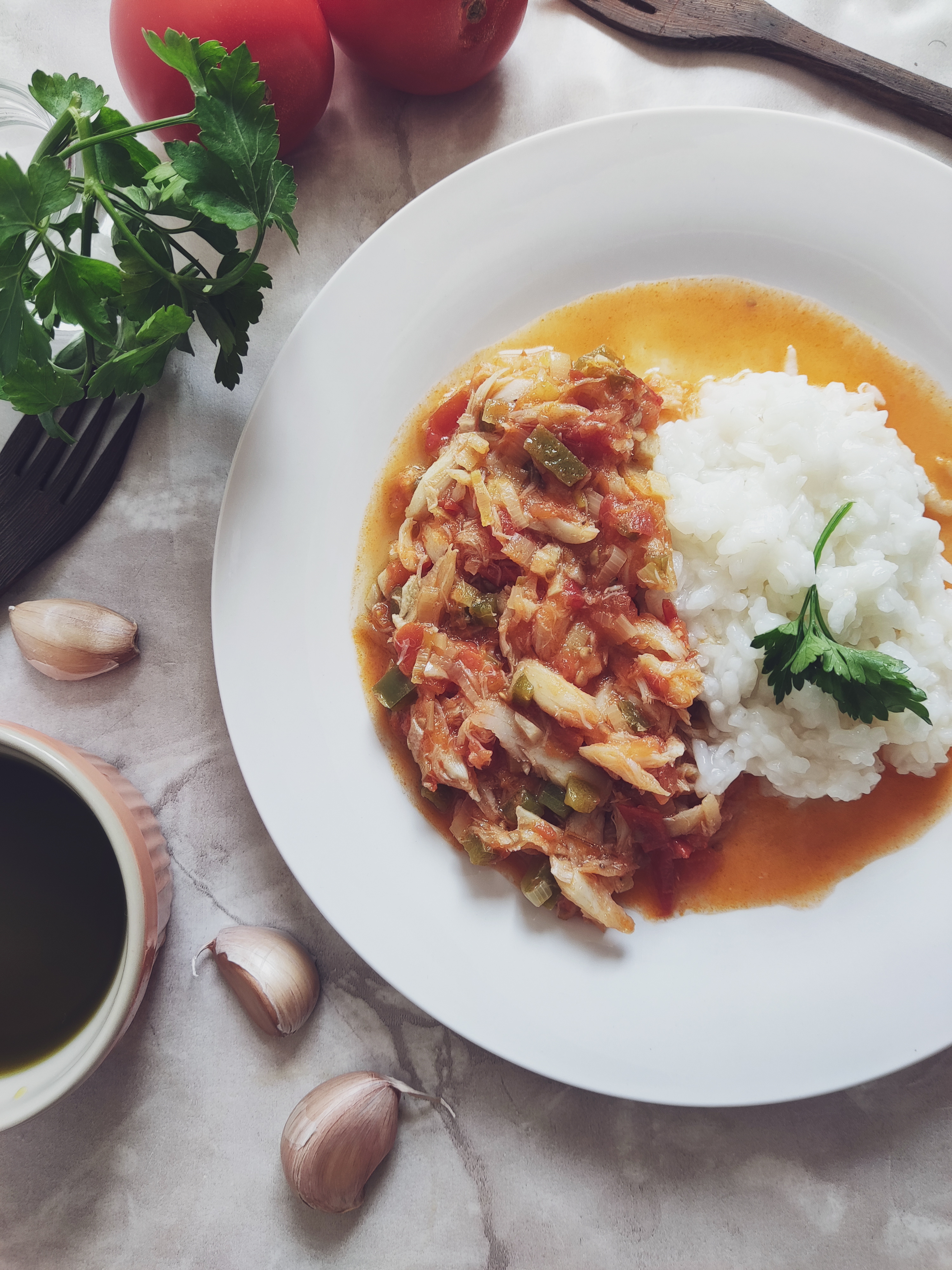 Triture o tomate e corte o pimento em pedaços pequenos. Adicione ambos ao tacho, bem como um pouco da água de cozedura do bacalhau. Deixe cozinhar em lume brando cerca de 10 minutos, prove e retifique sal se necessário (vai depender de quanto demolhado estava o bacalhau, pode não ser necessário adicionar sal).