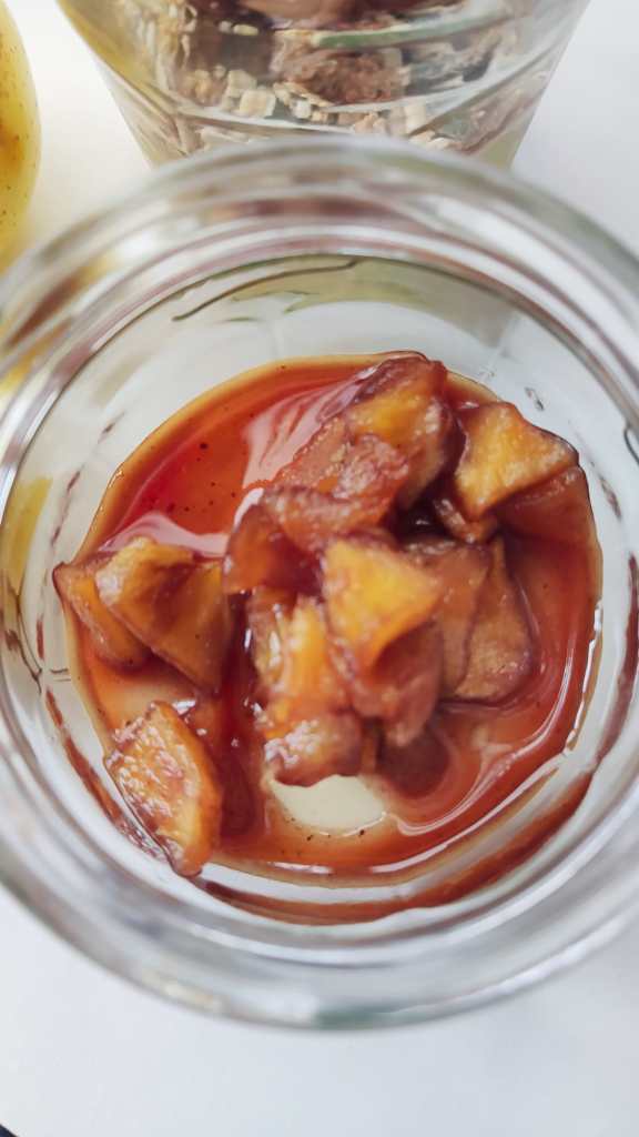 Descasque e corte as maçãs em cubos, coloque numa frigideira e adicione o vinho do porto e restante açúcar. Deixe cozinhar em lume baixo até caramelizar.