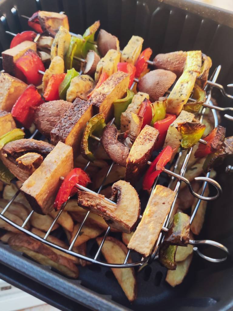 Pré aquecer a air fryer. Colocar as batatas no programa próprio (na minha é 25 minutos), a meio tempo agitar e, nesse momento, adicionar as espetadas.