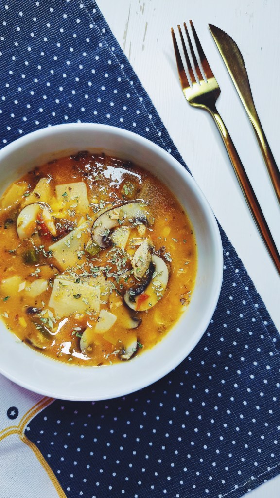 Laminar os cogumelos, cortar o pimento em fatias finas e juntar ao preparado. Deixar cozinhar um pouco e adicionar água a ferver, retificando o sal se necessário.