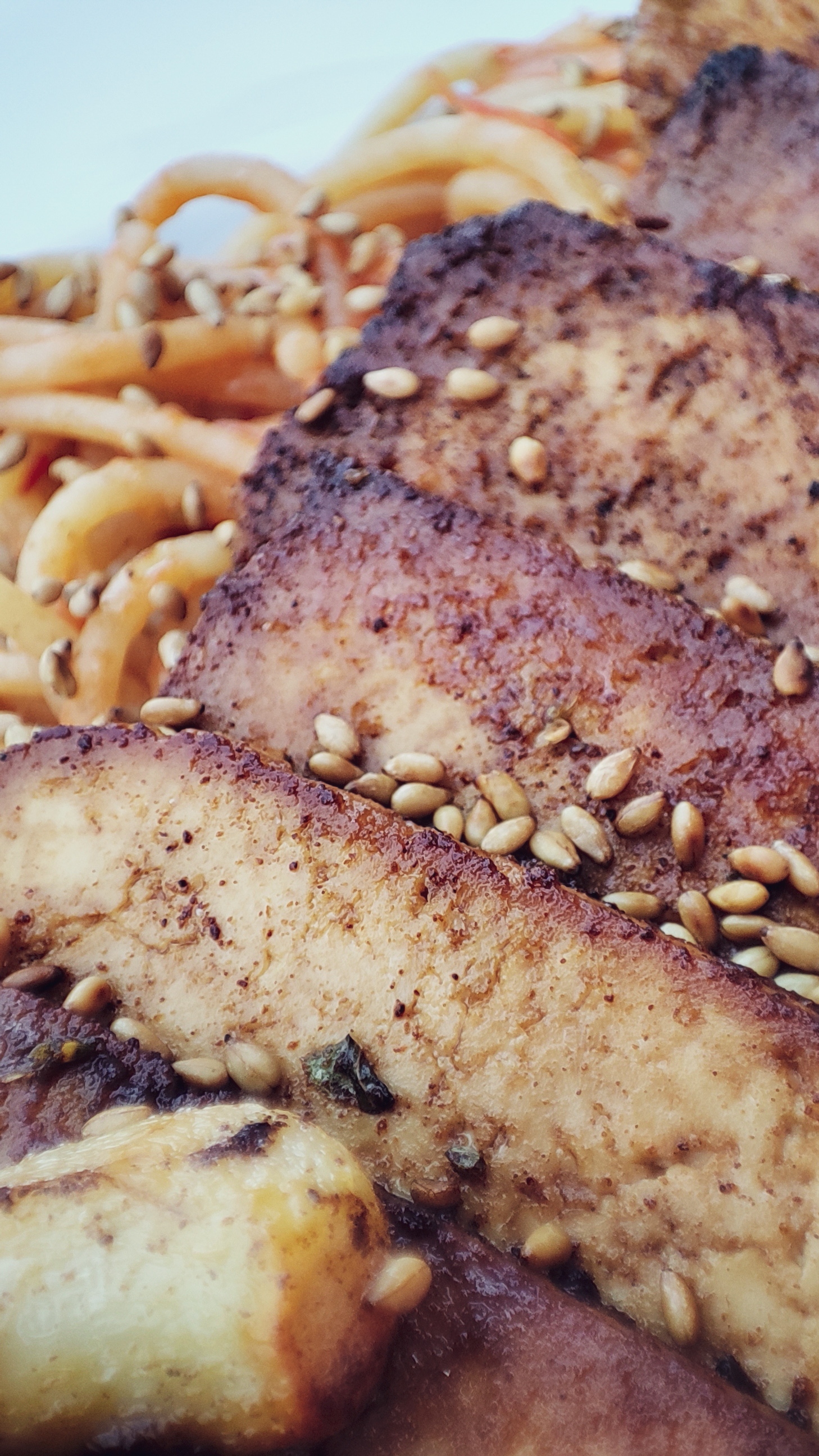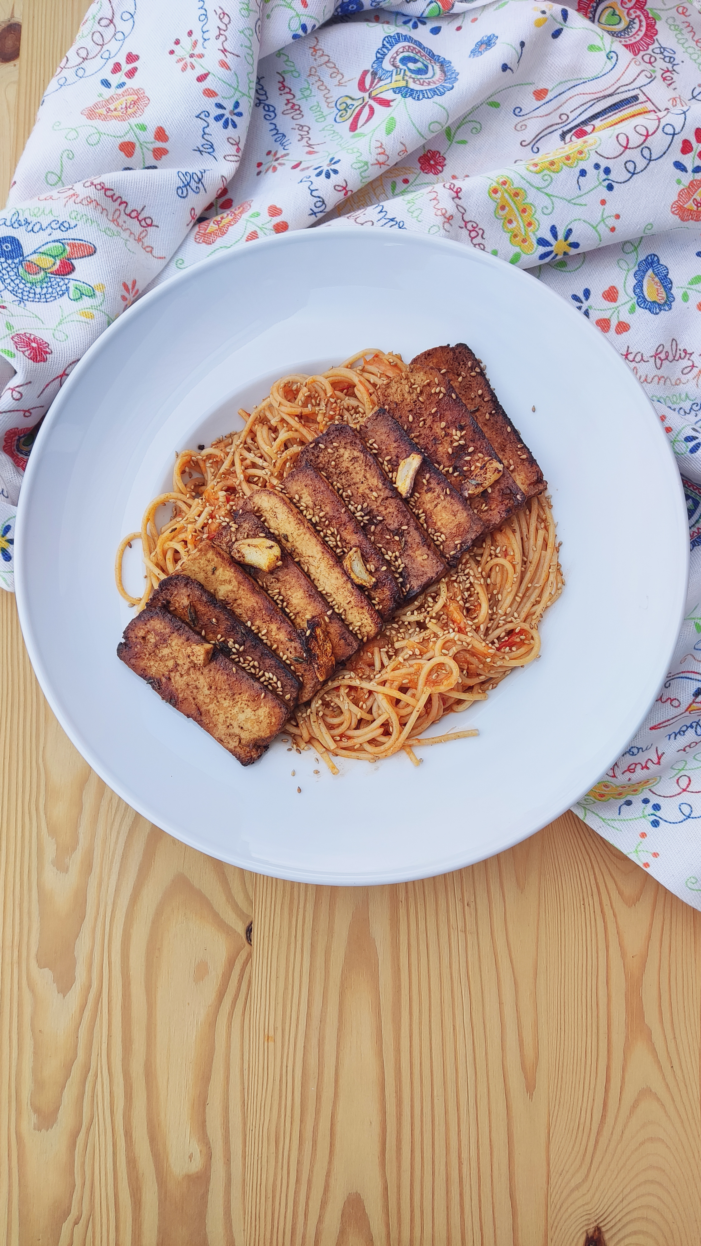 Sirva a massa envolvida no molho de tomate e o tofu com sementes de sésamo.